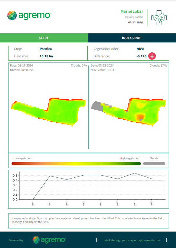 - Agremo provides two different alerts: Vegetation Emergence Alert and Vegetation Index Drop Alert