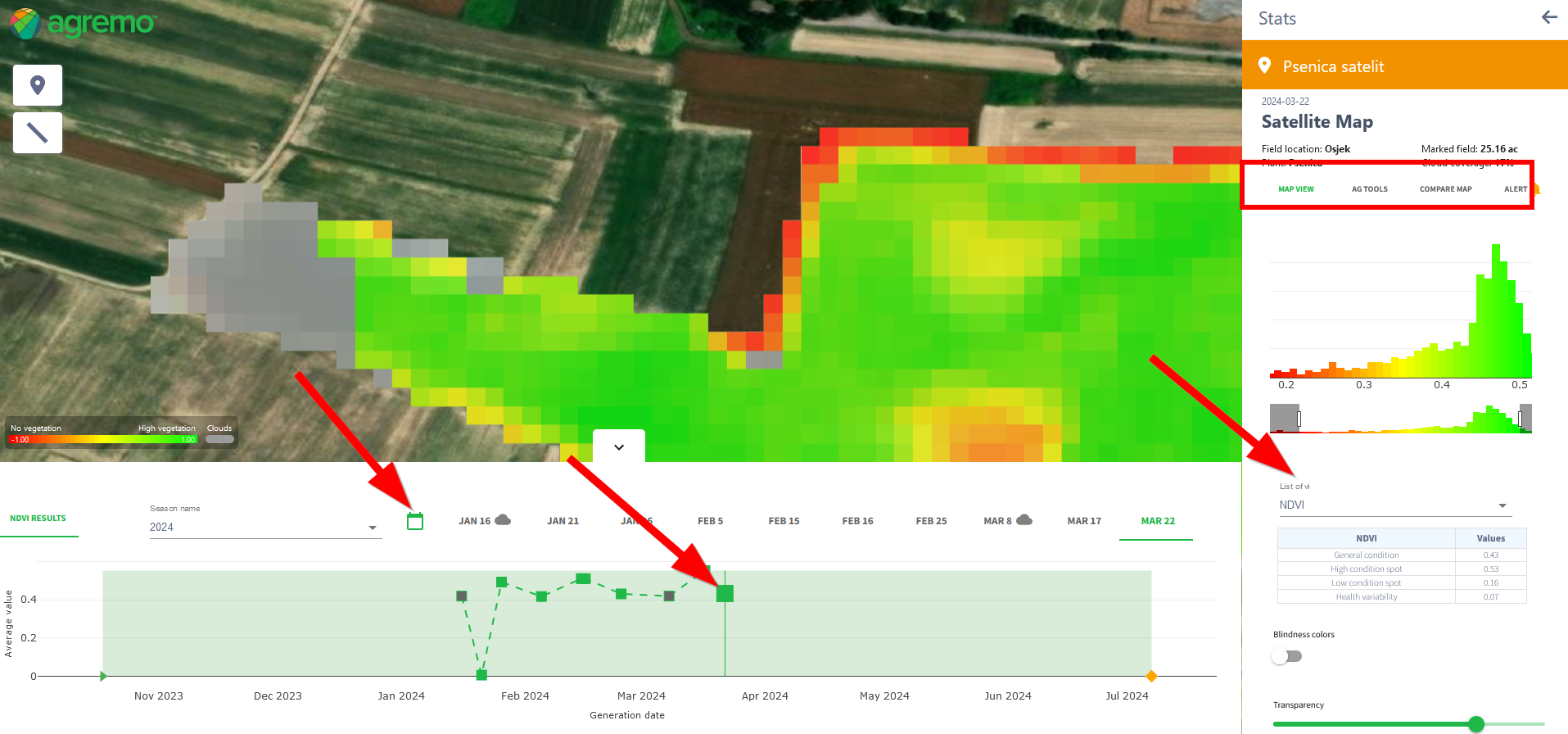 - Click on the map (box) in the chart with the exact dates of the generated map and NDVI values.