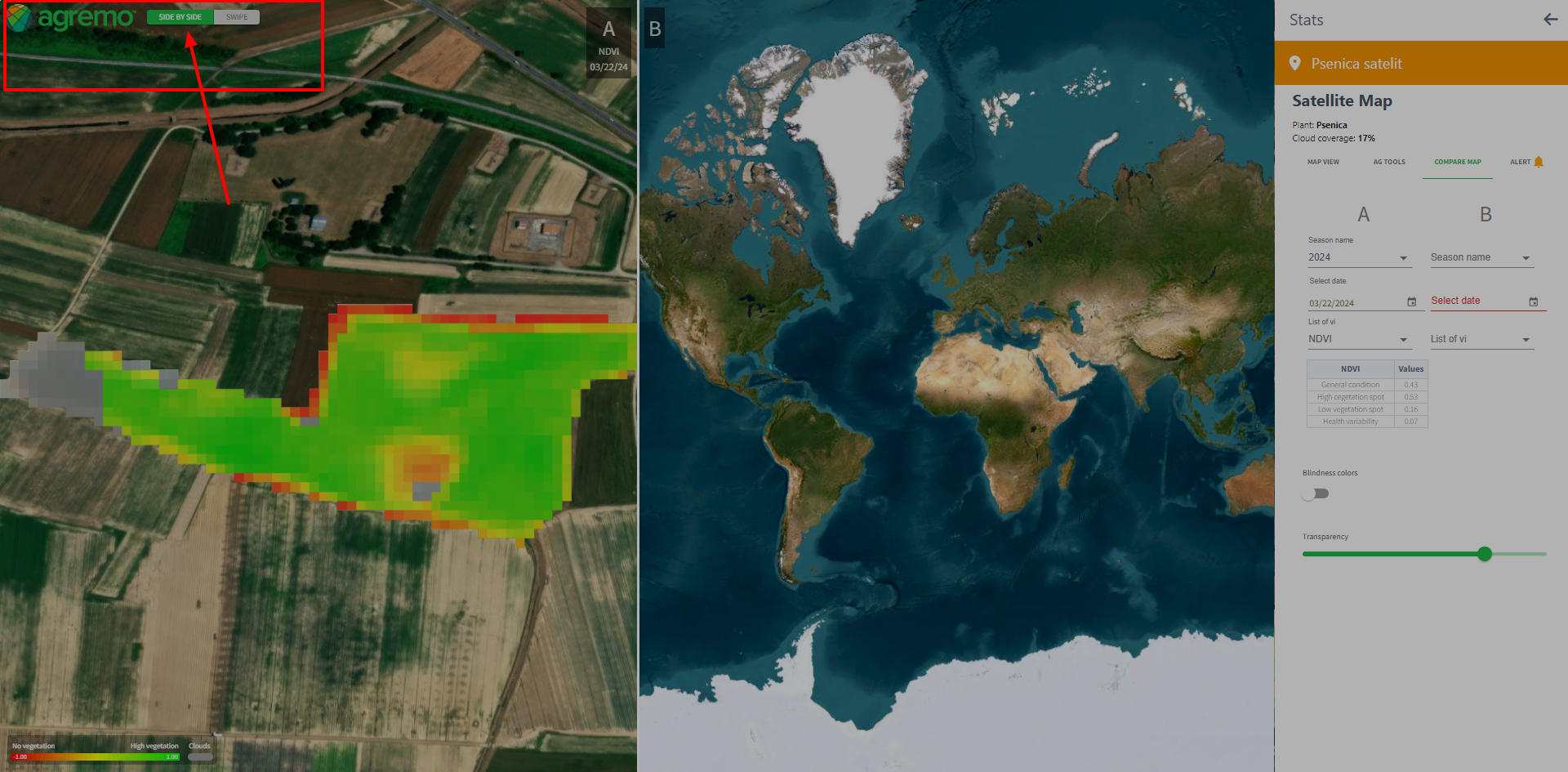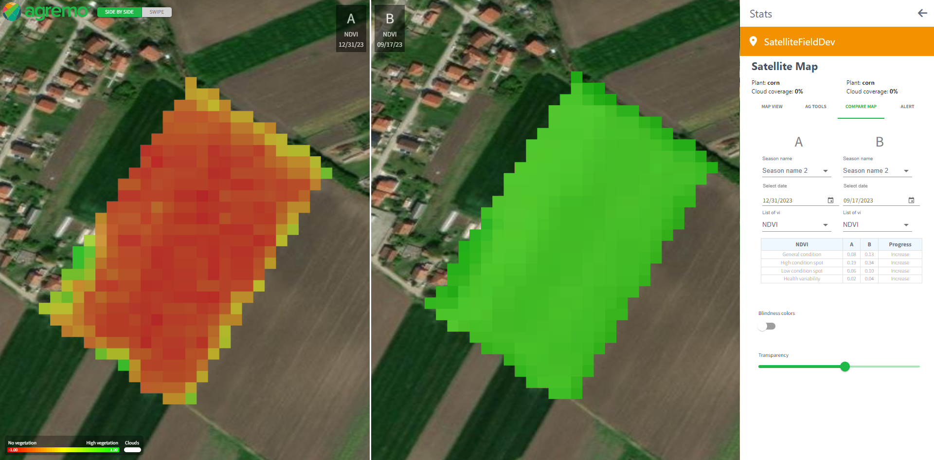 - Select maps to compare by choosing season, date, and VI.