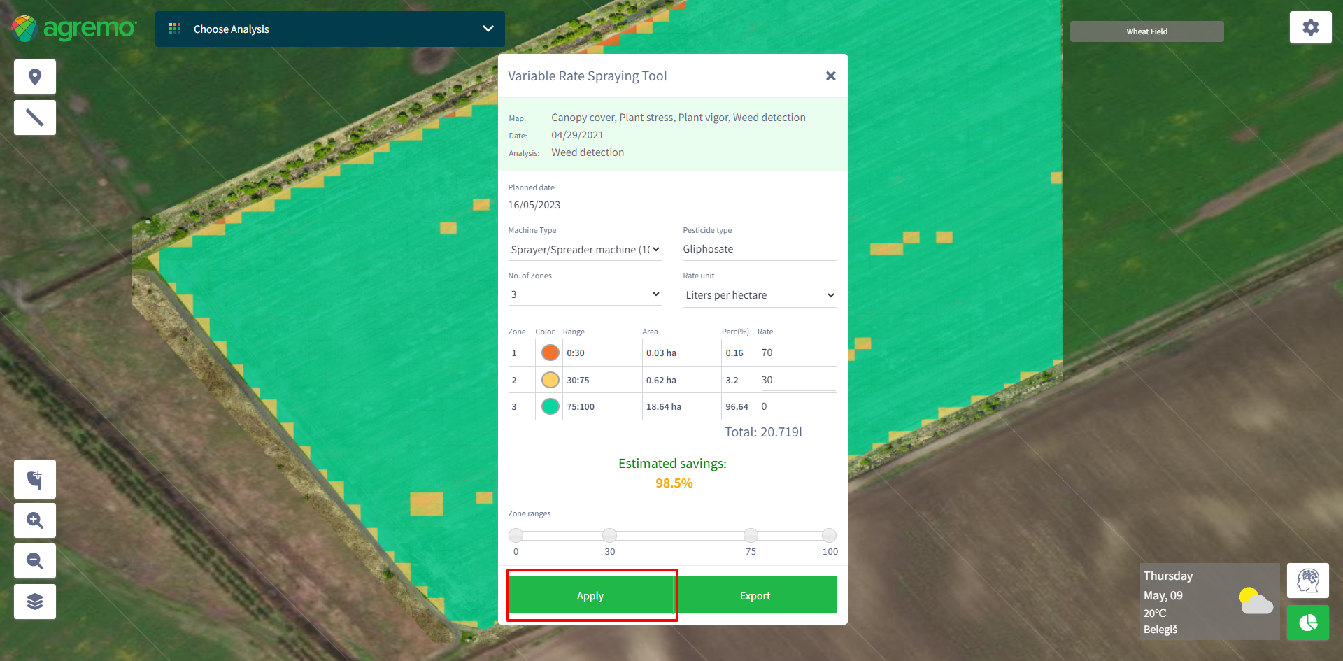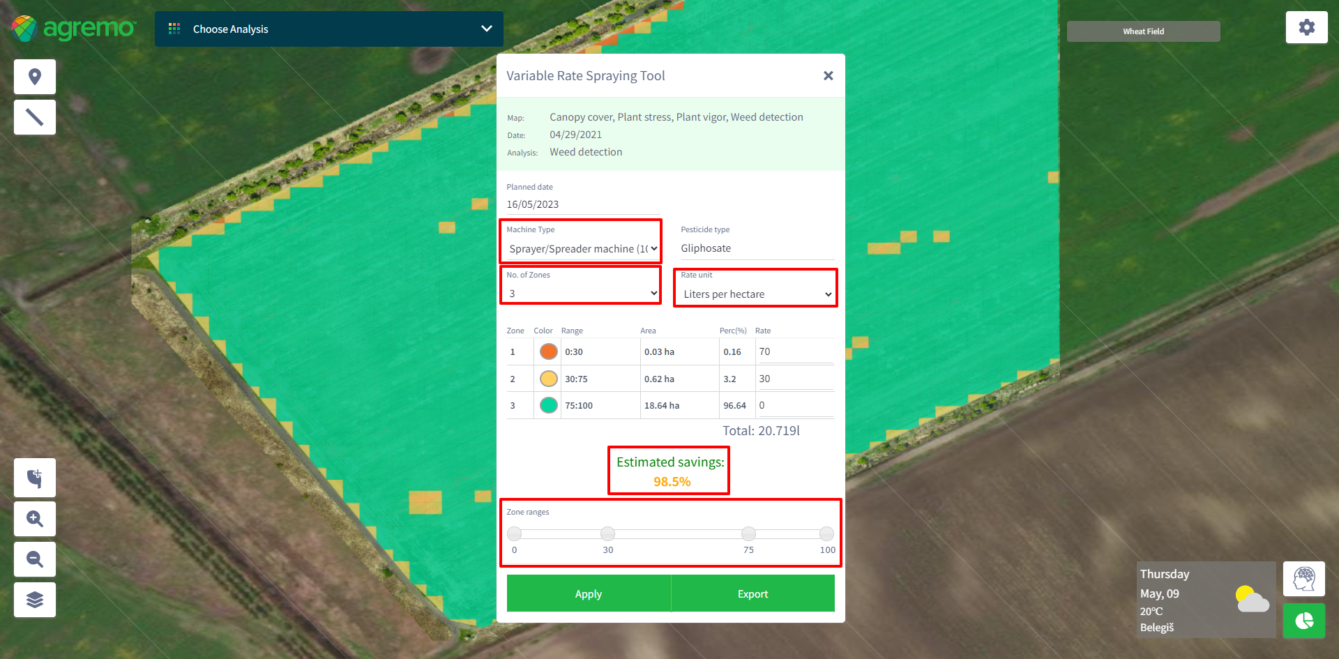 Users identify field variability/plant health monitoring analyses, create management zones (Spraying Tool), assign rates, and create Prescription files (Variable-rate prescriptions). Based on this, users can optimize application operations by applying the right amount of herbicide to the right spots.