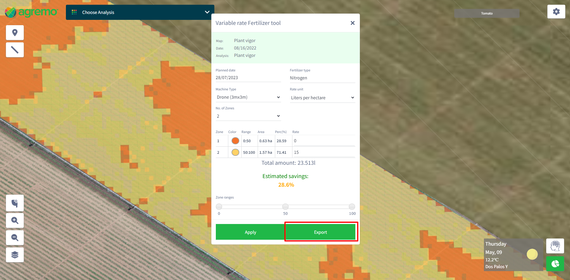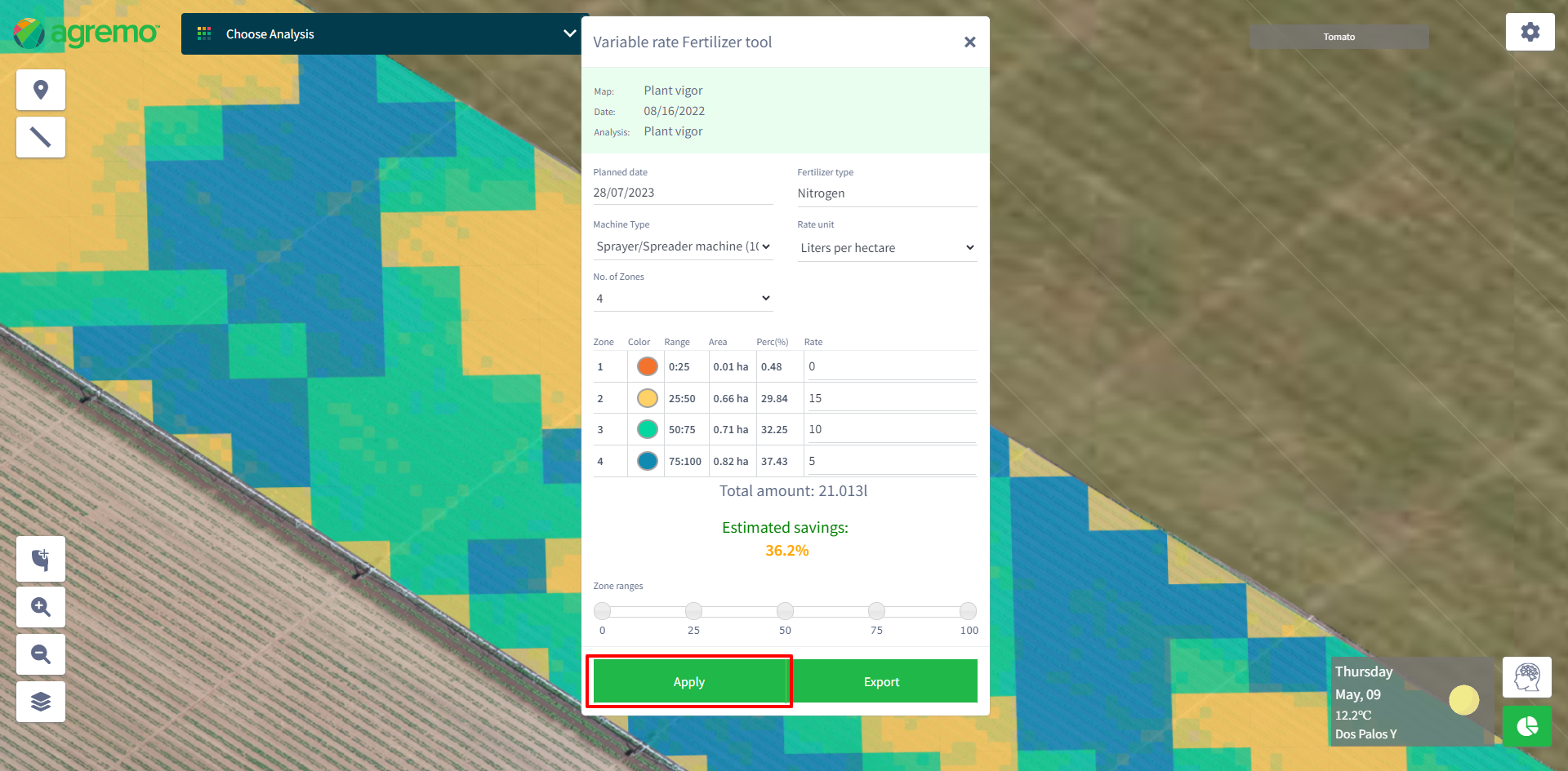 Users identify field variability – plant health (Plant Vigor analysis), create management zones (Fertilizer Tool), assign rates (Fertilizer Tools), and create Prescription files (Variable-rate prescriptions). Based on this, users can optimize application operations by applying the right amount of nutrients to the right spots.