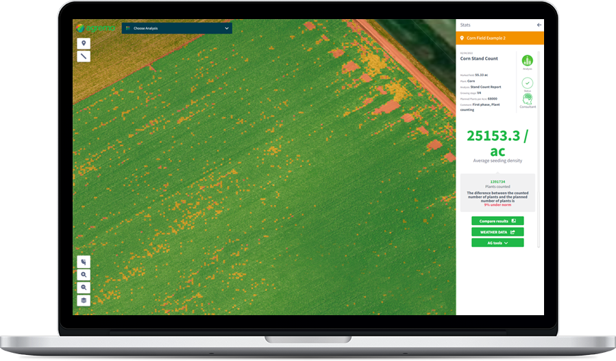 Ground counts can be expensive, unreliable, and depend on the area sampled. Stand count drone analytics is a combination of AI, machine learning, and computer vision that can give you insights into the whole farm precisely and quickly.